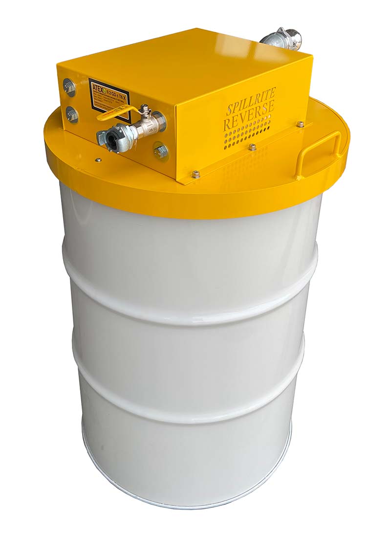 The Spillrite Drum Top Vacuum comes in several models. Reversible and Vacuum Only - Standard and explosion proof. The alloy Drum Top Vac is light weight and weighs 14 kgs. The yellow silencer is alloy and the internal components are plastic .