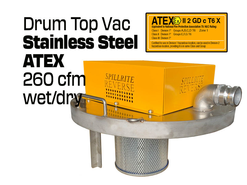 Drum Top Vacuum - ATEX -Explosion proof - Stainless steel power head & silencer shroud - 260 cfm vacuum only unit The Drum Top vacuum can recovery all wet and dry industrial waste .