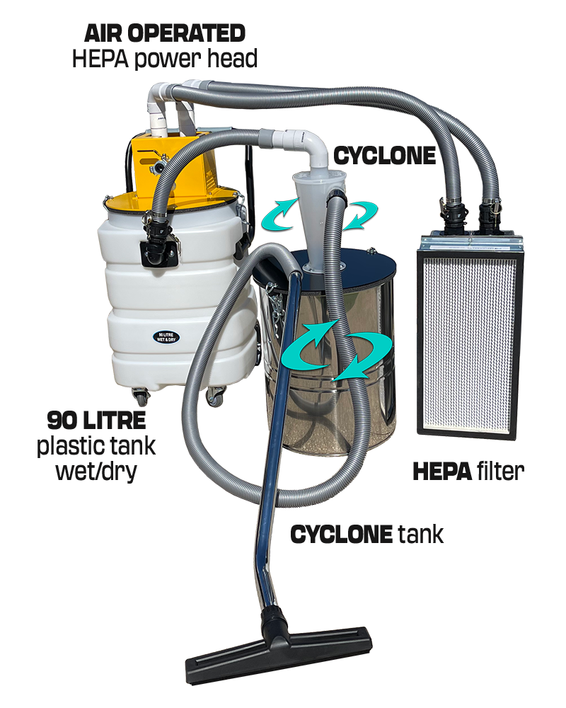 The Spillrite P90L/60/CYC/HEPA is an air operated pneumatic 90 litre plastic tank vacuum with industrial grade HEPA filtration. The unit is fitted with a cyclone to enable fast cleanup and extended run times without the need to constantly clean the filter. This unit is ideal for the vacuum up of silica dust with the HEPA filter on the exhaust which prevents toxic particles from escaping into the atmosphere.
